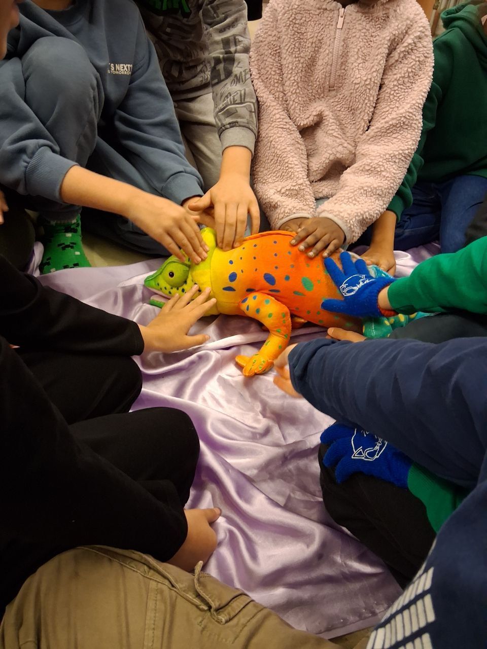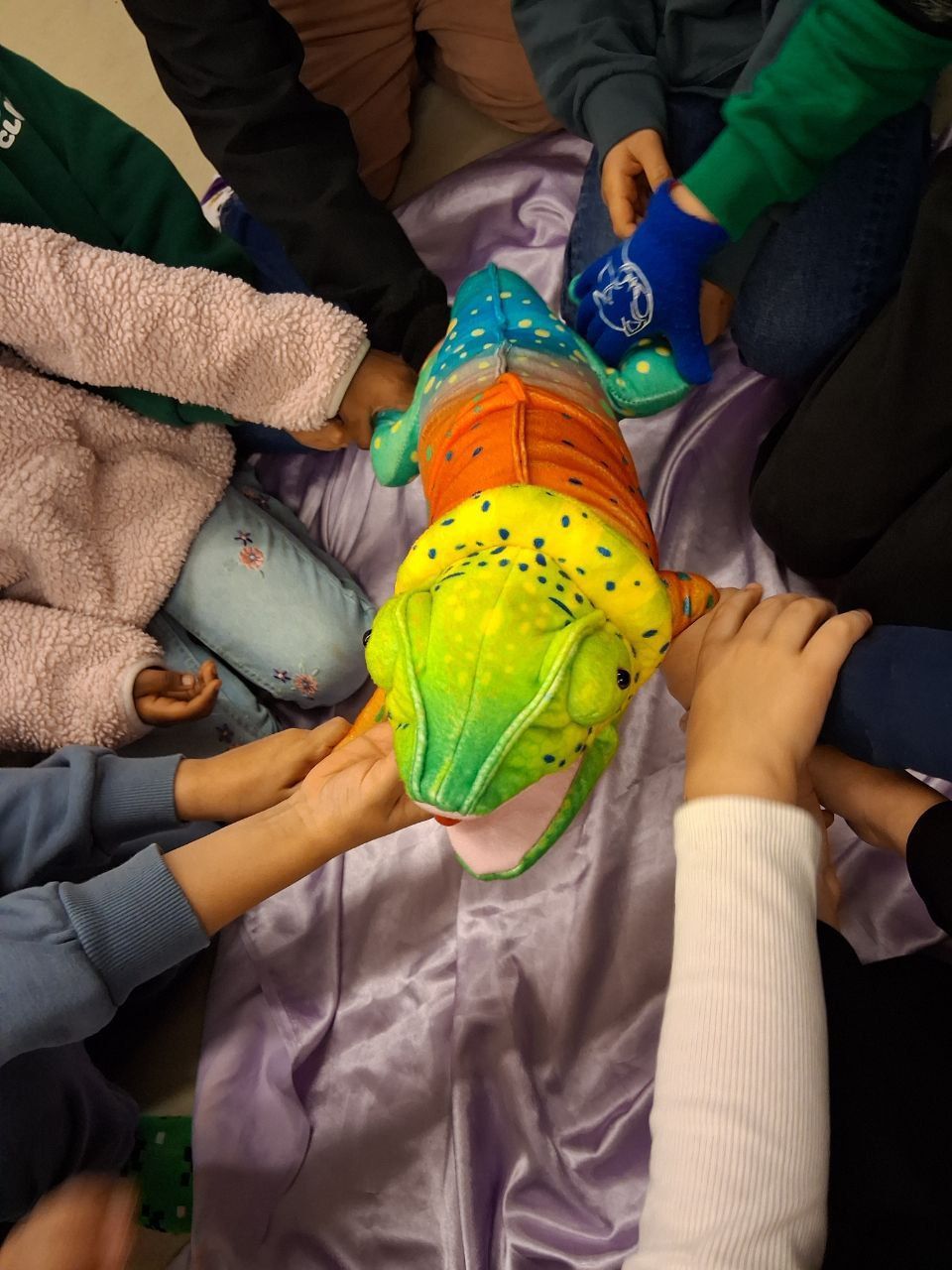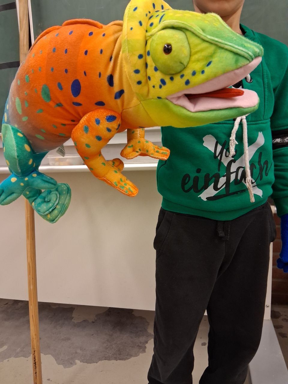 "Mach die Augen auf, mach die Ohren auf. So machen es Chamäleons auch." 12 Kinder des zweiten Jahrgangs haben sich seit September auf eine abenteuerliche Reise begeben: Zusammen mit dem Chamäleon "Ferdi" sind sie auf Schatzsuche und retten seine Freude. Dabei haben sie bereits den Gefühle-Gespenstern geholfen. Aktuell suchen sie zusammen mit Drache Rudi nach guten Lösungen bei Streitigkeiten.