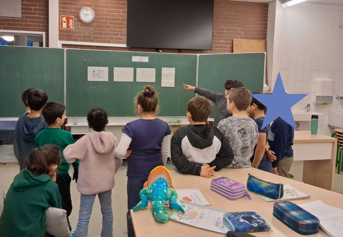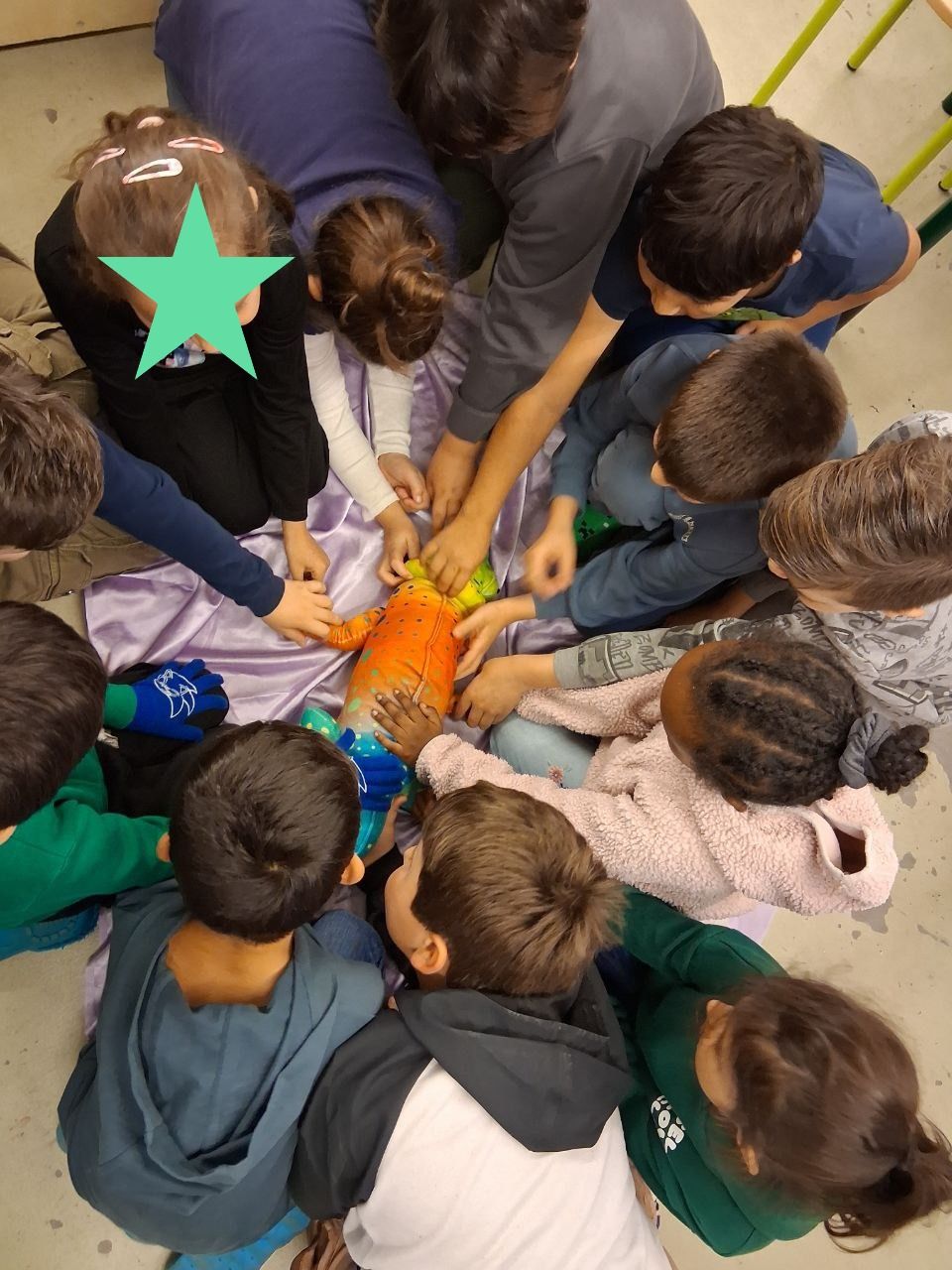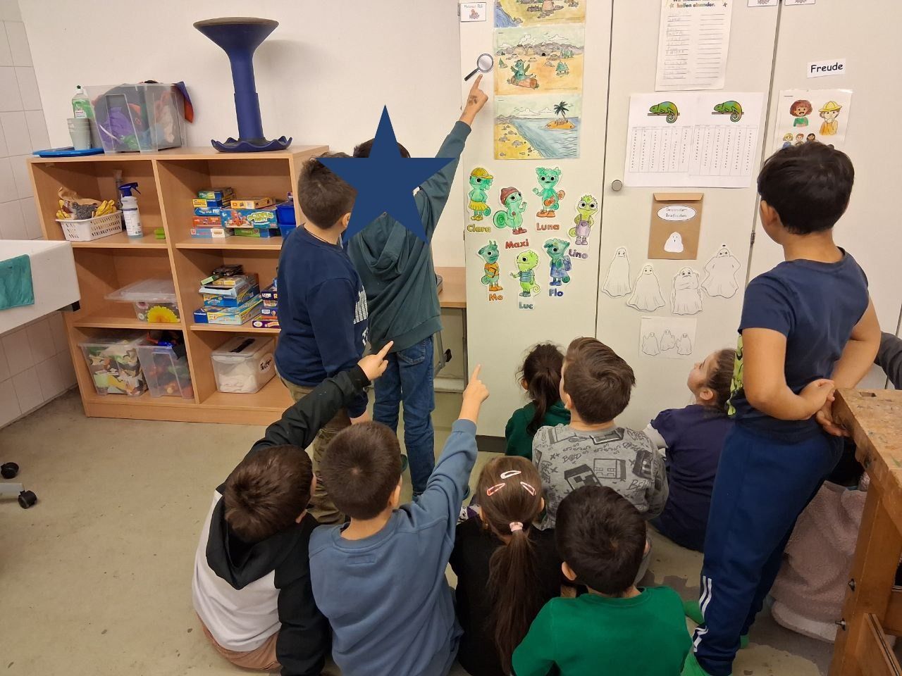 "Mach die Augen auf, mach die Ohren auf. So machen es Chamäleons auch." 12 Kinder des zweiten Jahrgangs haben sich seit September auf eine abenteuerliche Reise begeben: Zusammen mit dem Chamäleon "Ferdi" sind sie auf Schatzsuche und retten seine Freude. Dabei haben sie bereits den Gefühle-Gespenstern geholfen. Aktuell suchen sie zusammen mit Drache Rudi nach guten Lösungen bei Streitigkeiten.