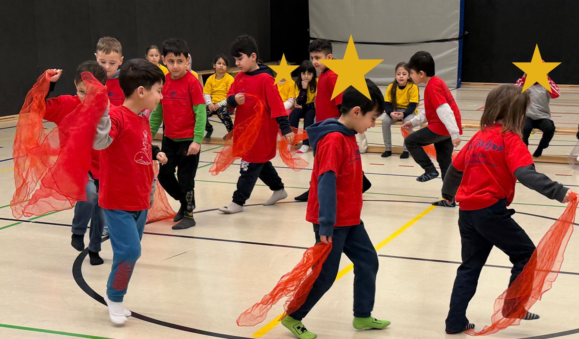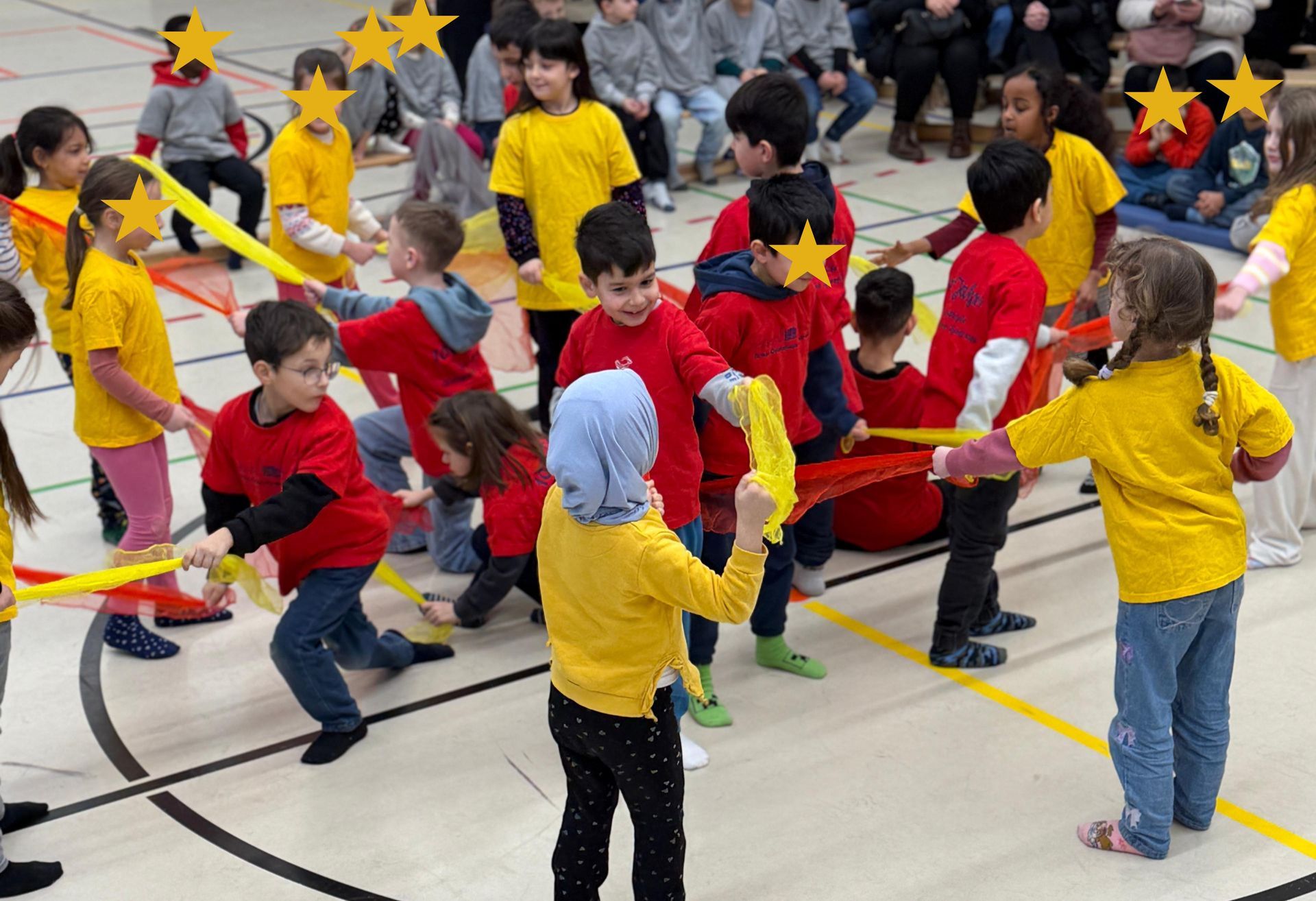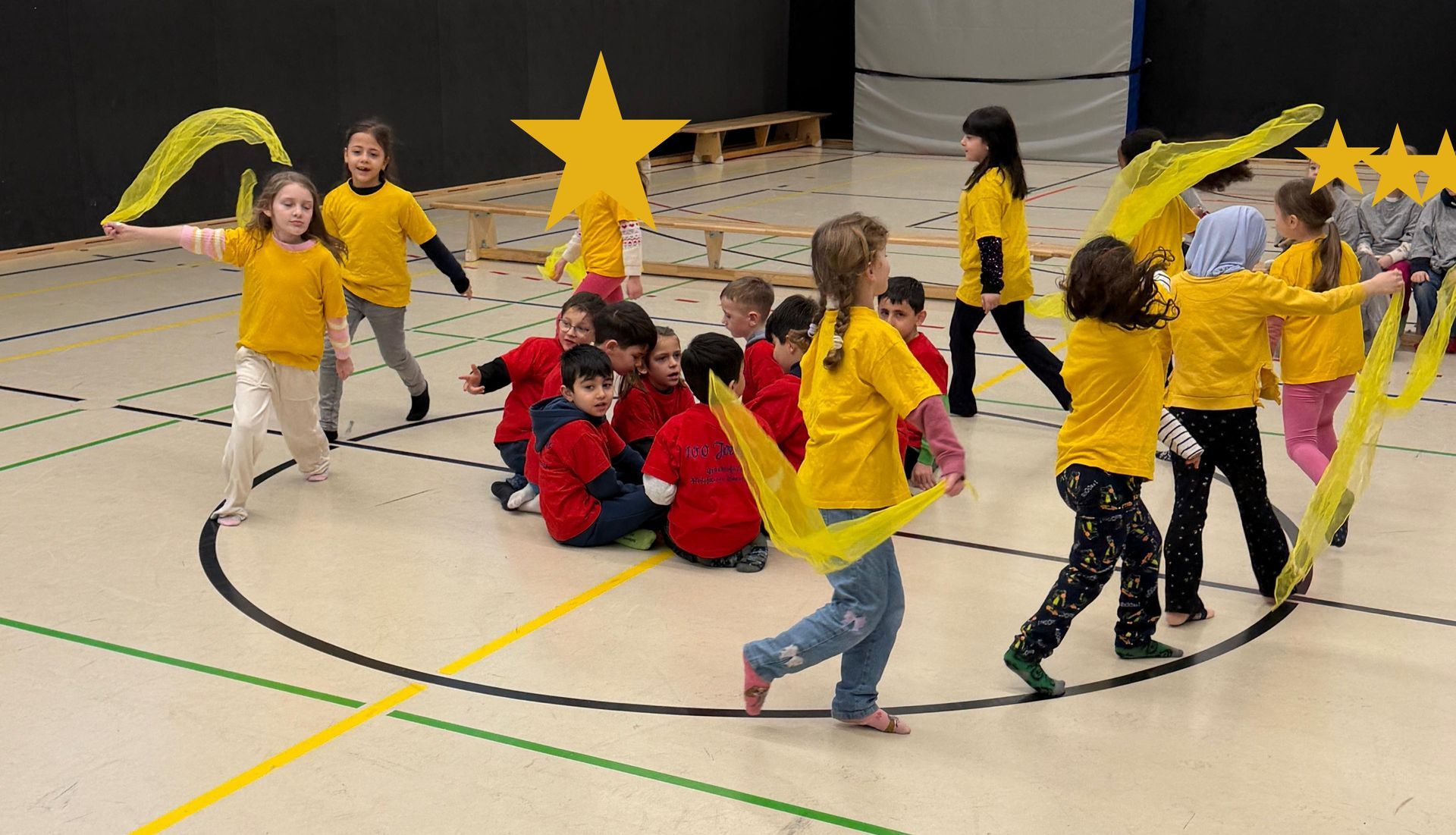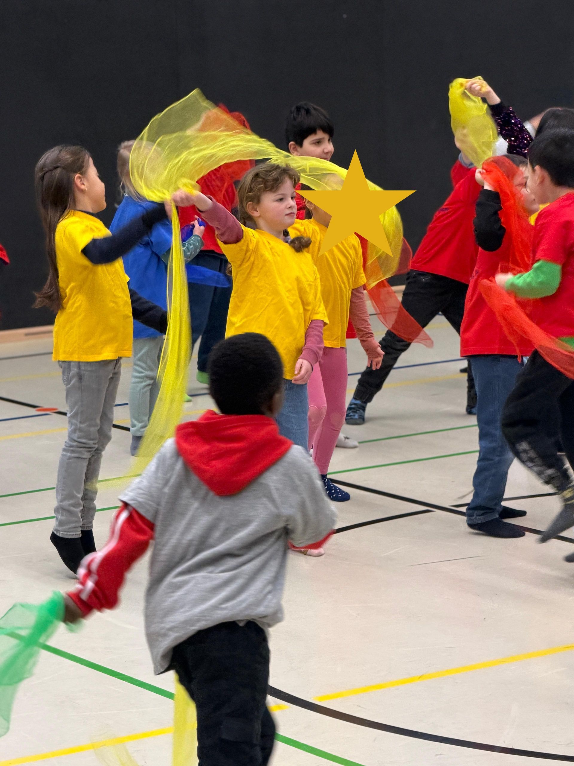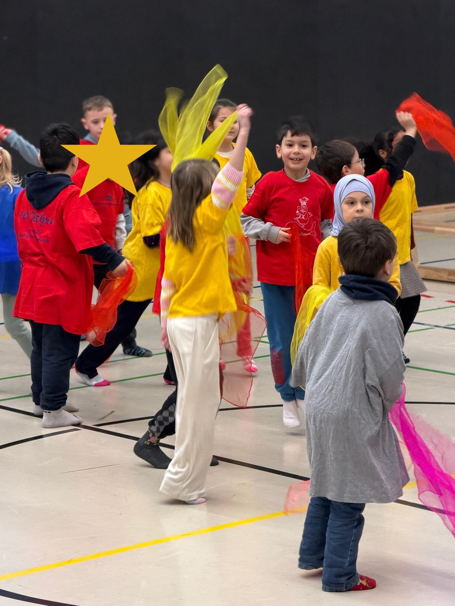 Auf den Hunnen zu einem gemeinsamen Tanzprojekt rund um das Bilderbuch „Die Königin der Farben“ von Jutta Bauer. Gemeinsam mit unseren Schüler:innen entwickelten die Kinder kleine Tanz-sequenzen zu den Farben Rot, Gelb und Blau. Mit Musik, Bewegung und bunten Tüchern wurden Gefühle sichtbar und die Farben lebendig. Höhepunkt war eine gemeinsame Aufführung, bei der alle Kinder mit viel Freude und Mut auftraten.