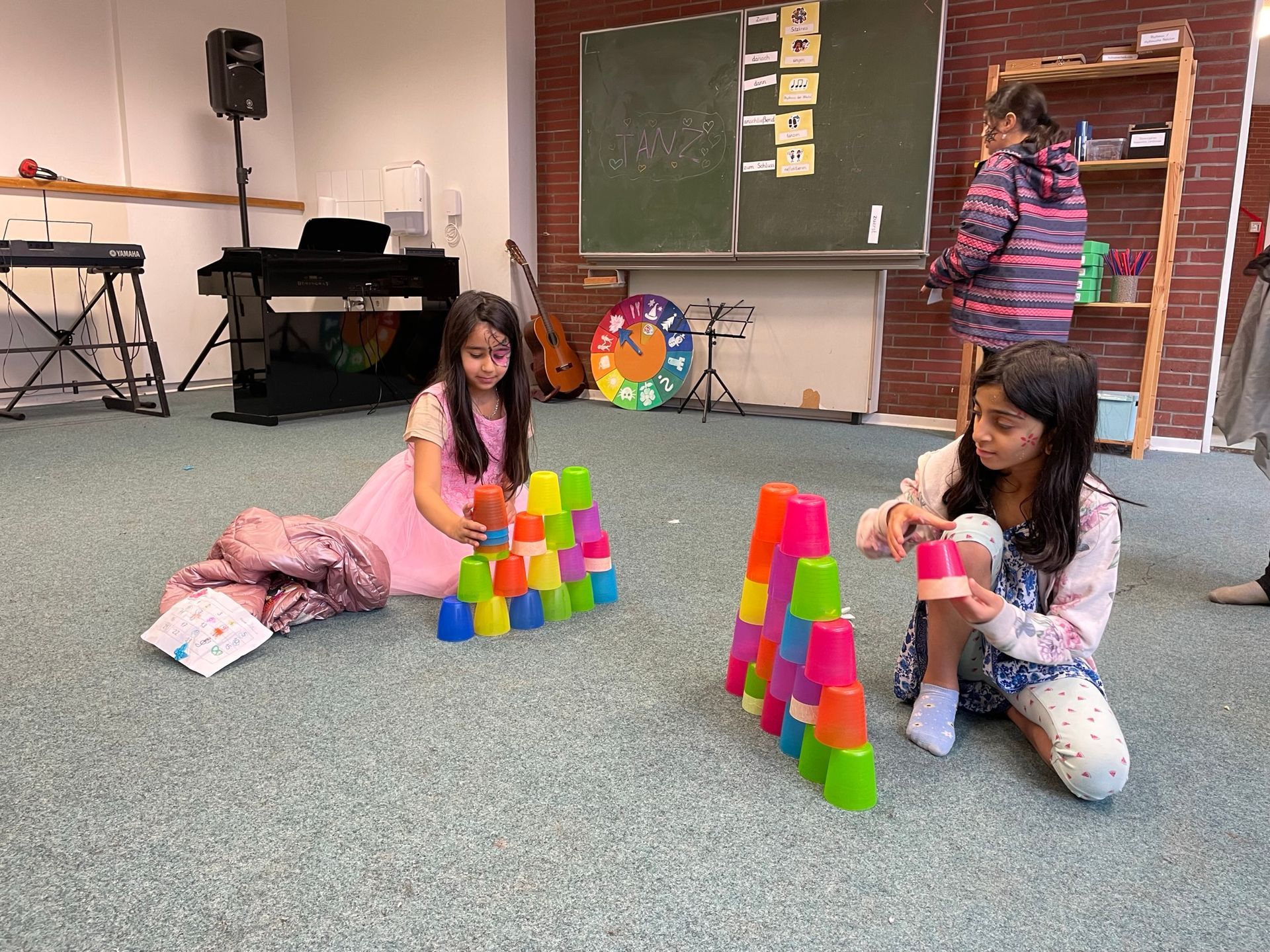 Das Fest startete im Klassenraum mit Spielen, Tanz und Leckereien. Im Anschluss durften sich alle Schüler:innen in den Schulgebäuden frei bewegen und unterschiedlichste Angebote wahrnehmen: Sitztanz, Flaschenangeln, Eierlauf, Clown-Wurf, Limbo oder auch Kartoffelfegen.