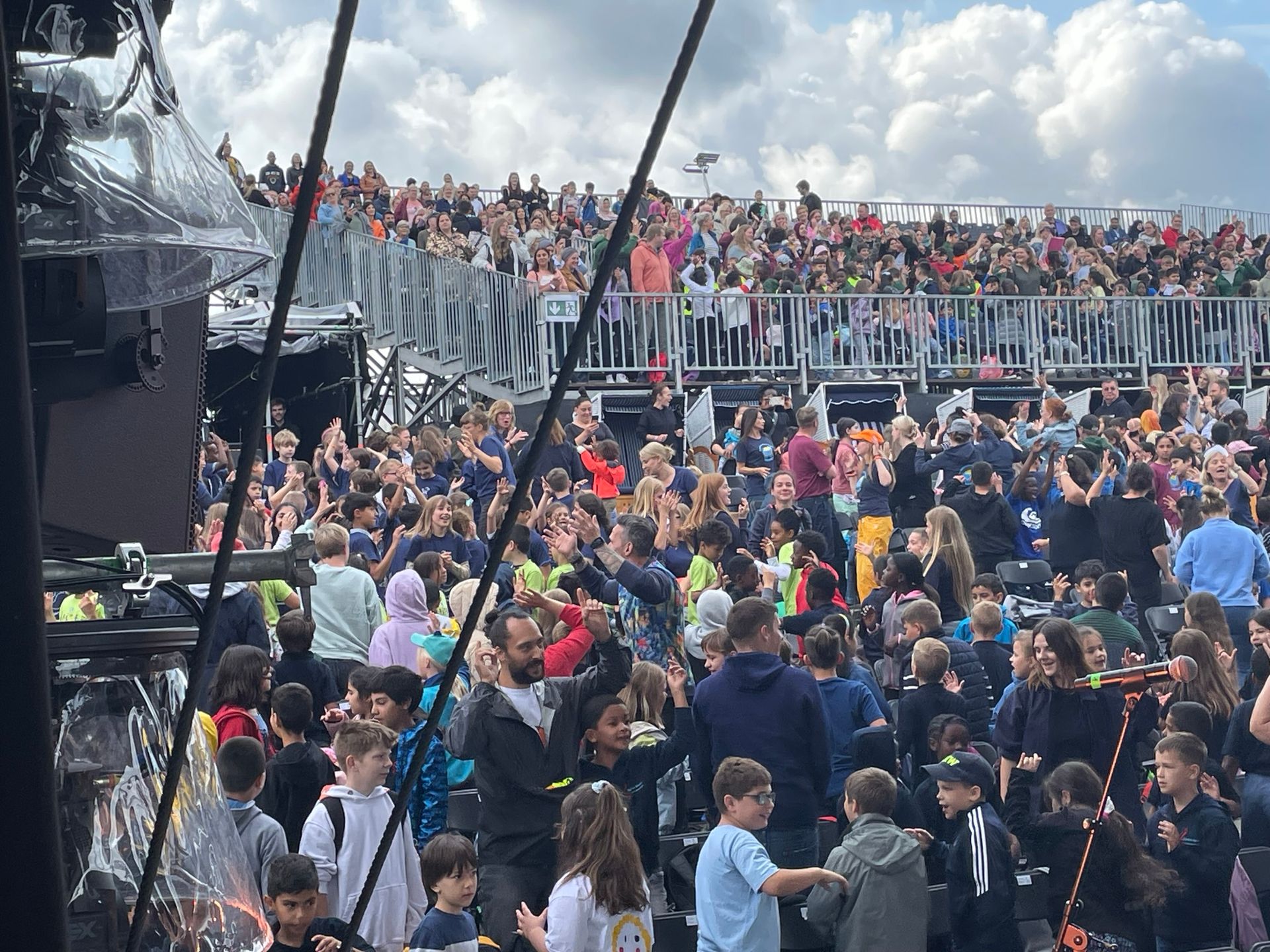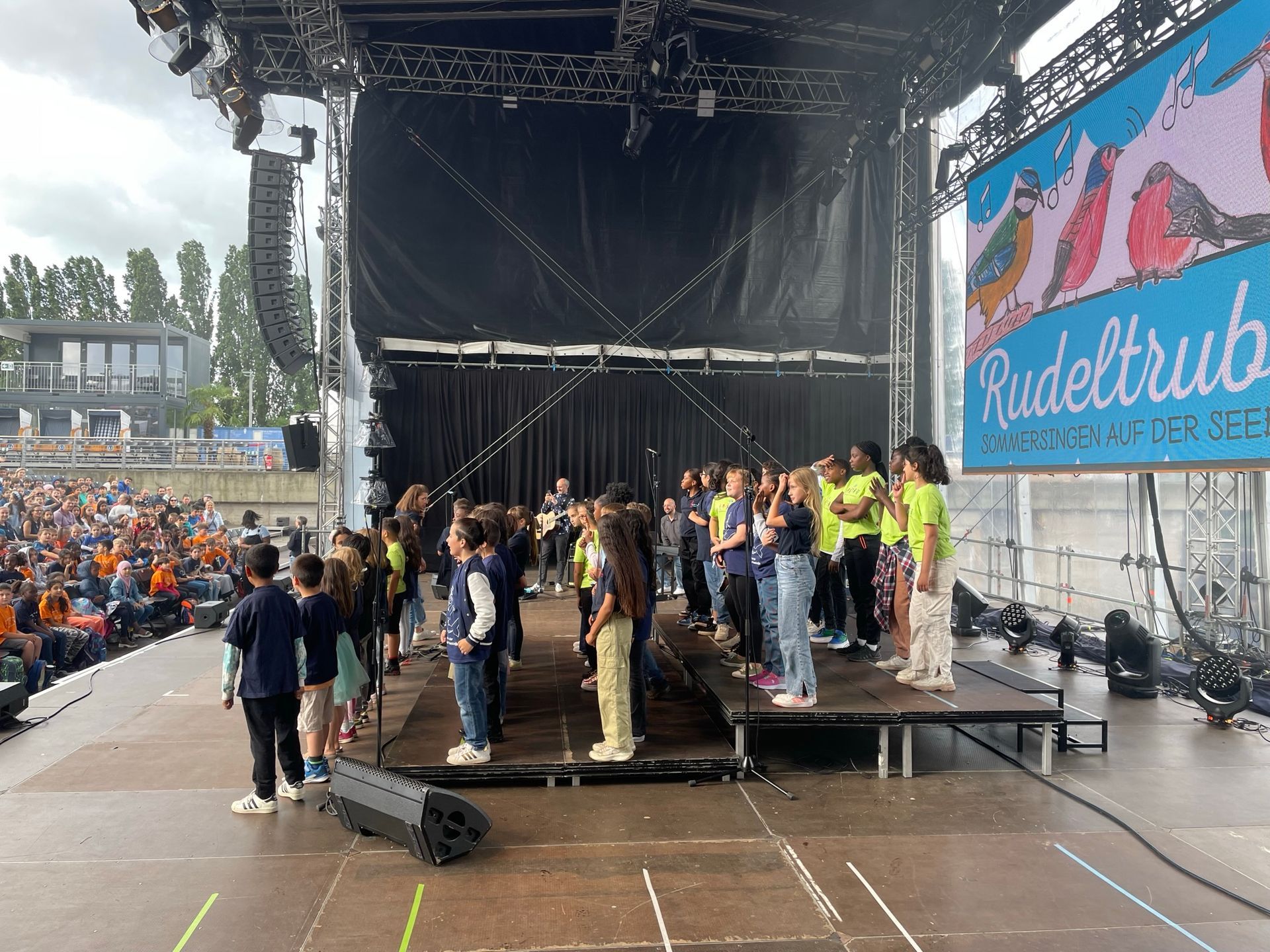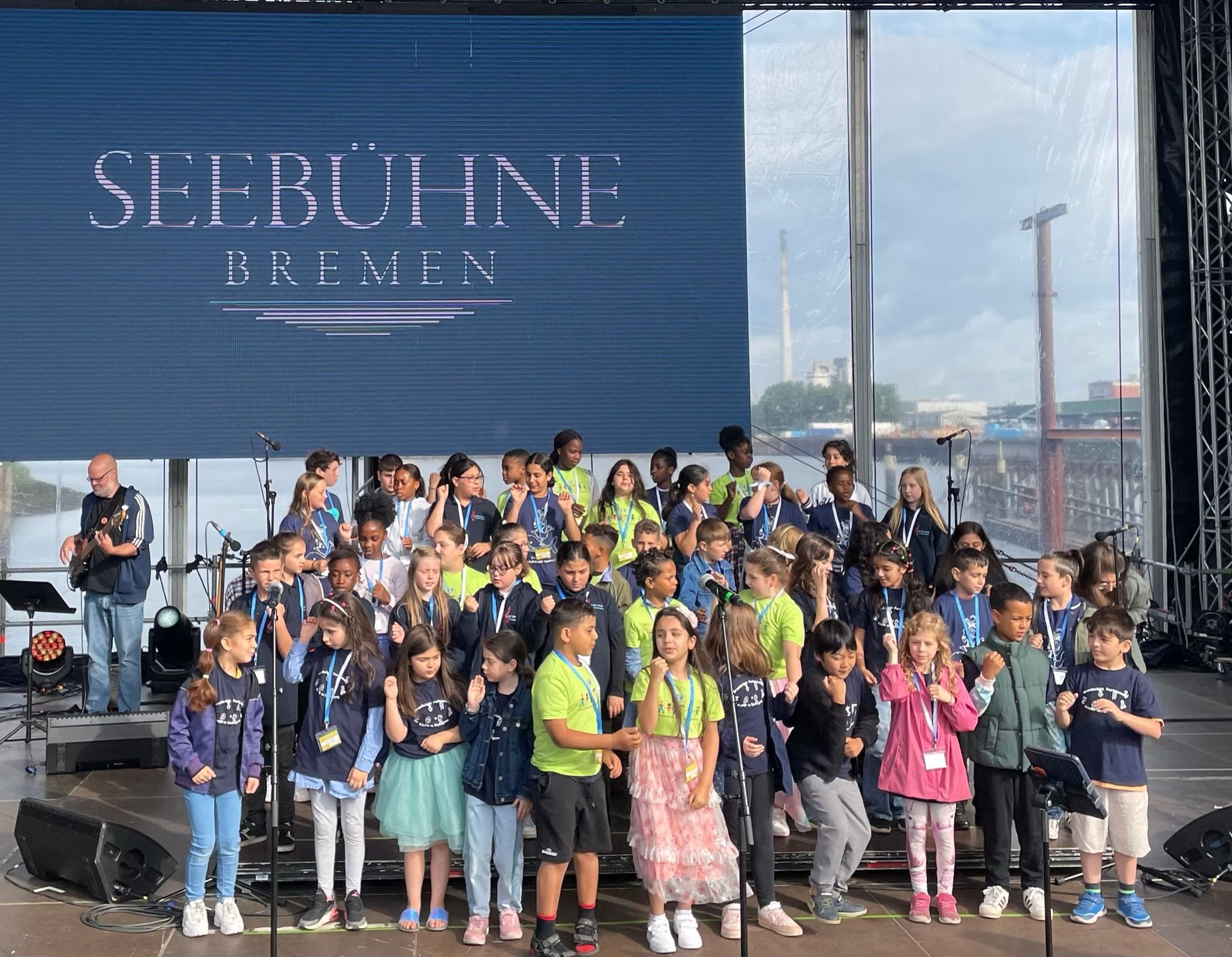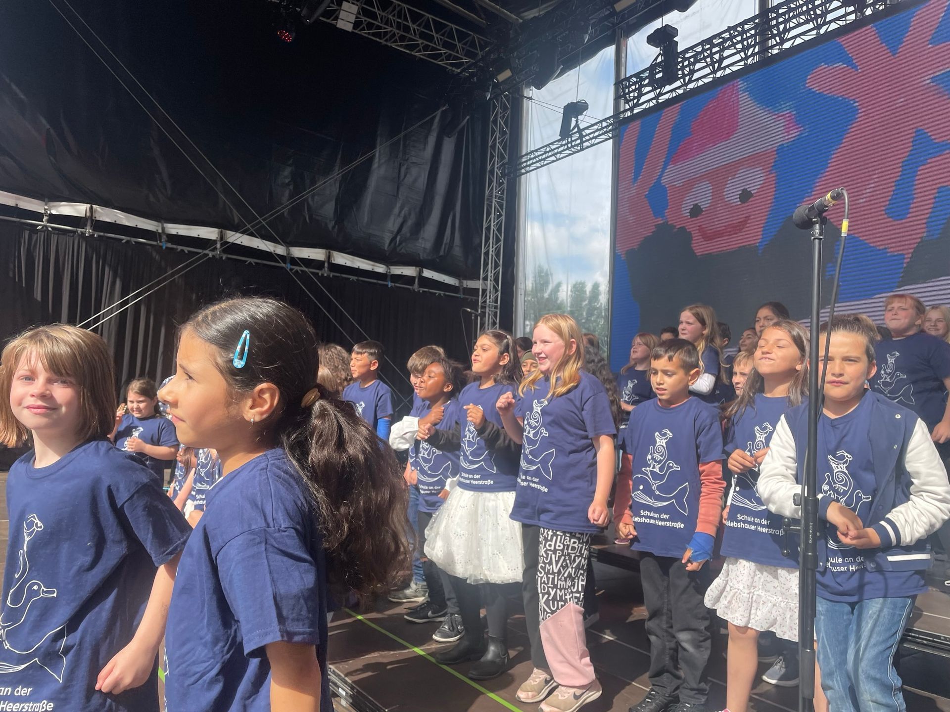 Die Seebühne an der Waterfront ist eigentlich großen Stars vorbehalten, aber einen Vormittag lang gehörte sie Schüler:innen aus fünf Gröpelinger Grundschulen. Auch unsere Schule war beim 1. "Rudeltrubel" dabei. Die Schüler:innen haben sich wochenlang auf das Singevent vorbereitet: Sechs Lieder wurden mithilfe von Lernvideos eingeübt. Ein besonderes Highlight war die Uraufführung unseres neuen Schulsong "In Vielfalt leben und lernen". Die Bühne und Tribüne wurde von unseren Kindern gerockt!